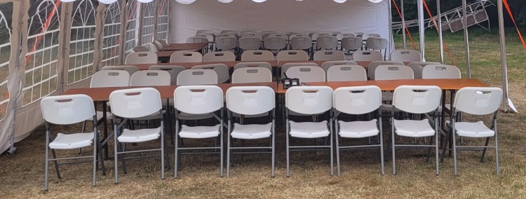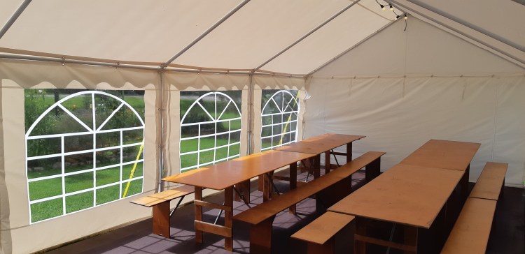 Vineerist valmistatud peolaua komplekt koosneb lauast mõõtmetega 74×220 cm ja pinkidest mõõtmetega 26×220 cm. Komplekti mahub istuma ca 8 inimest.